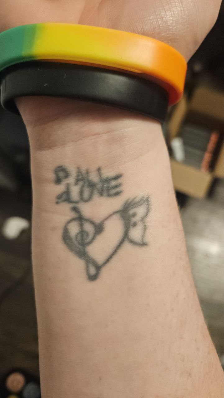 My first tattoo ever also had meaning to me when I got it. It's still visible on me and I don't plan to cover it up any time soon. It hasn't soured, it just stopped meaning anything. I was 18 when I got it and very much in love. Our tattoos didn't match, we had enough sense to avoid that, but they are very similar. Fortunately, I do still love music. There's many ways for something to lose it meaning. This is just another doodle on my skin now. I don't hate it, but I don't really feel anything for it. I think I may get it cleaned up though, it wasn't very well done. That's something else I have learned. Get a good artist. A good looking tattoo is better than a special meaningful tattoo any day.