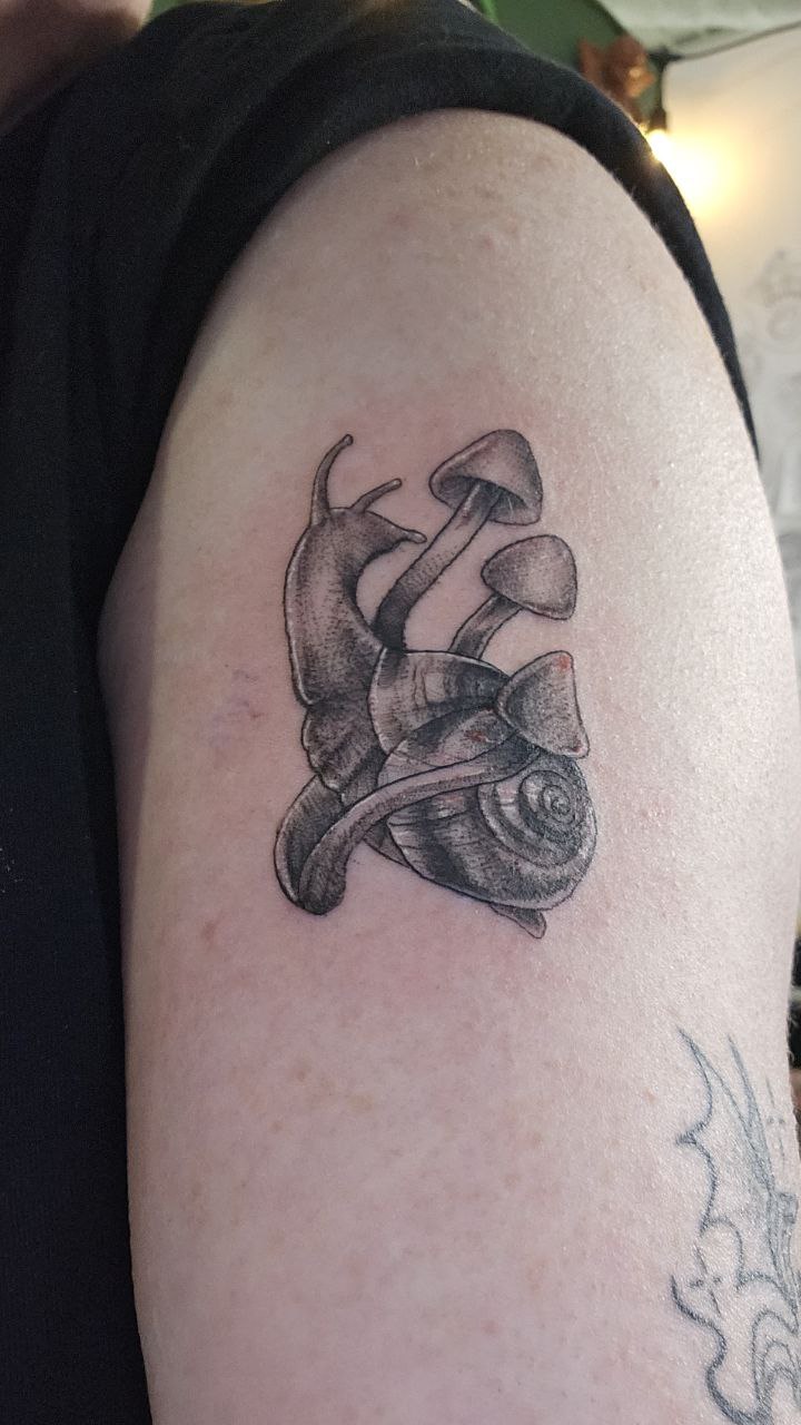 To me, permanence is a myth. Nothing is forever. My tattoos will only exist as long as I do. Sure, that's forever to me, I suppose. But I don't see it that way. If I keep getting tattoos, which I plan to do, the art on my skin will be constantly in flux. Right now there is a snail with some mushrooms chilling somewhat alone on my upper arm. But in a few years, who knows what will surround him? I could grow a whole universe around that little guy for him explore. Who will his future neighbors be? Will they get along? I hope so! Yes, the snail will be on my skin forever. He's a very handsome little guy. But his surroundings and context will absolutely change. Little by little, the art that is my skin will evolve. It will grow and change with me. And I think that is beautiful.